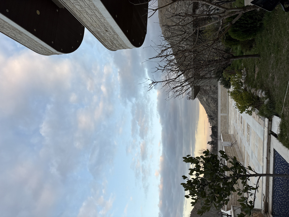 This image captures an outdoor scene in Munin, Syria, depicting a landscaped residential or resort property under a partly cloudy sky at dusk. The sky, occupying the upper two-thirds, is light blue with scattered white and gray stratocumulus clouds, showing faint pink and orange hues near the distant horizon. In the foreground, to the left, a small tree with dark green leaves stands next to a rectangular water feature with blue and white mosaic tiling. Adjacent to this, a large, irregularly shaped patio is paved with light-colored, square and rectangular stone tiles. Low stone walls, constructed from rectangular blocks matching the building's facade, delineate the far edge of the patio, potentially serving as planters or retaining walls. To the right of the patio, a landscaped garden area features green grass, small green shrubs, and several bare, deciduous trees with intricate branch patterns. Rocks line the edge of a garden bed separating the grass from the paved area. The upper right portion of the image displays a modern, multi-story building segment characterized by two distinct, curved, cantilevered balconies or terraces. The building's exterior is faced with light-colored, rectangular stone blocks. The undersides of these balconies are dark and contain visible recessed circular light fixtures. In the mid-ground and background, rocky, arid hills dominate the landscape. A visible concrete structure or platform is perched on a distant hillside. No individuals, animals, or explicit actions are present within the frame.