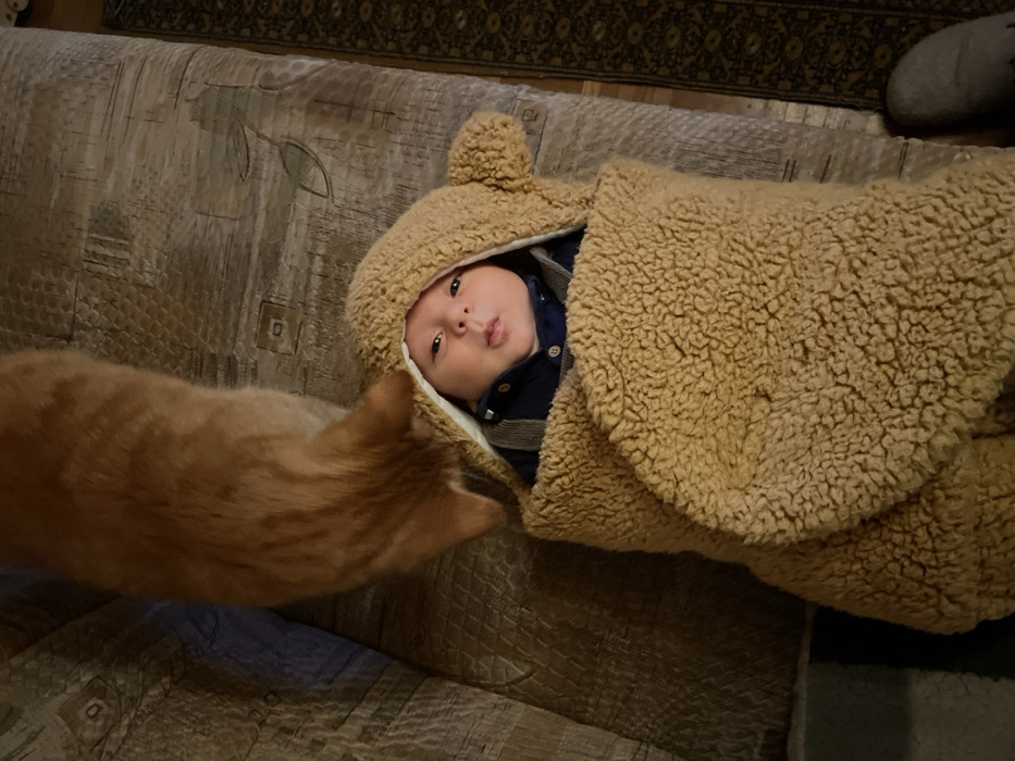A baby, wrapped in a fuzzy, brown, bear-eared blanket, lies on a textured couch. The baby is wearing a dark blue collared shirt. An orange cat approaches the baby, its head close to the blanket's edge. Part of a gray shoe sits in the top right corner of the frame. A patterned rug is partially visible in the top background.