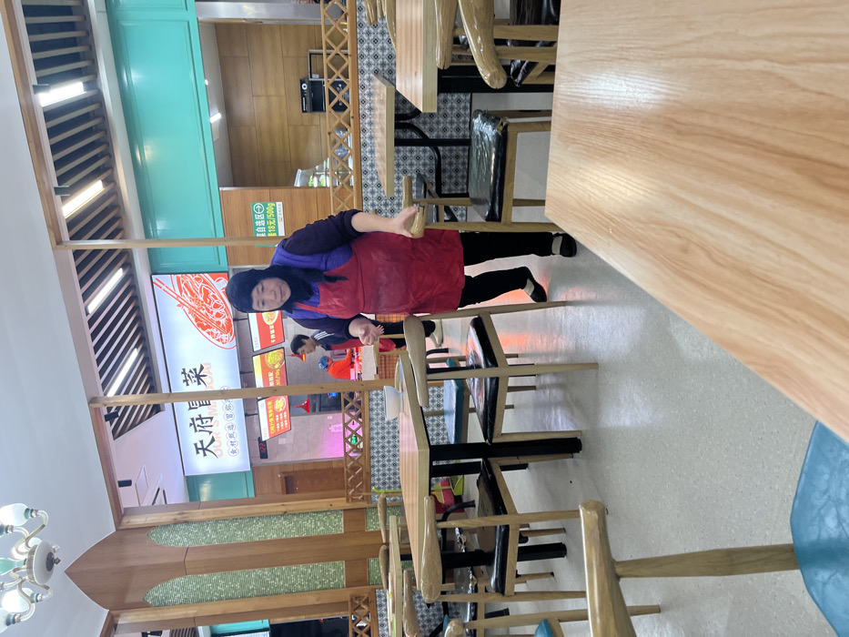 The image displays an indoor dining area, identified as a restaurant or food court, located in Jiangjin, China. In the immediate foreground, an older woman is positioned centrally, facing the viewer. She wears a dark head covering, a purple long-sleeved shirt, black trousers, black shoes, and a red apron. Her right hand rests on the back of a light wooden dining chair. The dining area is furnished with multiple light-colored wooden tables featuring dark metal bases, accompanied by wooden chairs with either black or teal cushioned seats. A white bowl is visible on one of the tables in the mid-ground. The floor is a light, uniform color. In the background, a service counter is present. Above it, a large illuminated sign displays Chinese characters "天府冒菜" (Tianfu Maocai) alongside a graphic depiction of food. Below this main sign are smaller digital menu boards with Chinese text. Two additional individuals are visible behind the counter, presumed to be staff members. One wears a red cap and a blue top, while the other wears a dark top. A green informational sign to the right features an arrow, Chinese characters indicating "自选区" (Self-service area), and pricing "18元/500g" (18 yuan per 500g). Architectural elements include wooden panels and framing, some incorporating green mosaic-like tiling. Overhead lighting consists of multiple fluorescent tube fixtures and a decorative chandelier in the upper left corner. The overall scene depicts a functional dining establishment during operational hours.