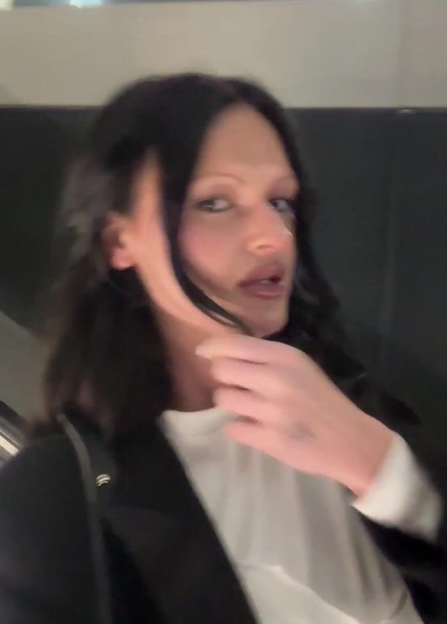 person with dark hair, a white shirt, and a black jacket standing in front of a dark background. The person seems to be talking, but their words are not clear at first. A hand briefly covers the person's face. The person is then seen on an escalator with two other people behind them. The person on the escalator smiles and waves at the camera.