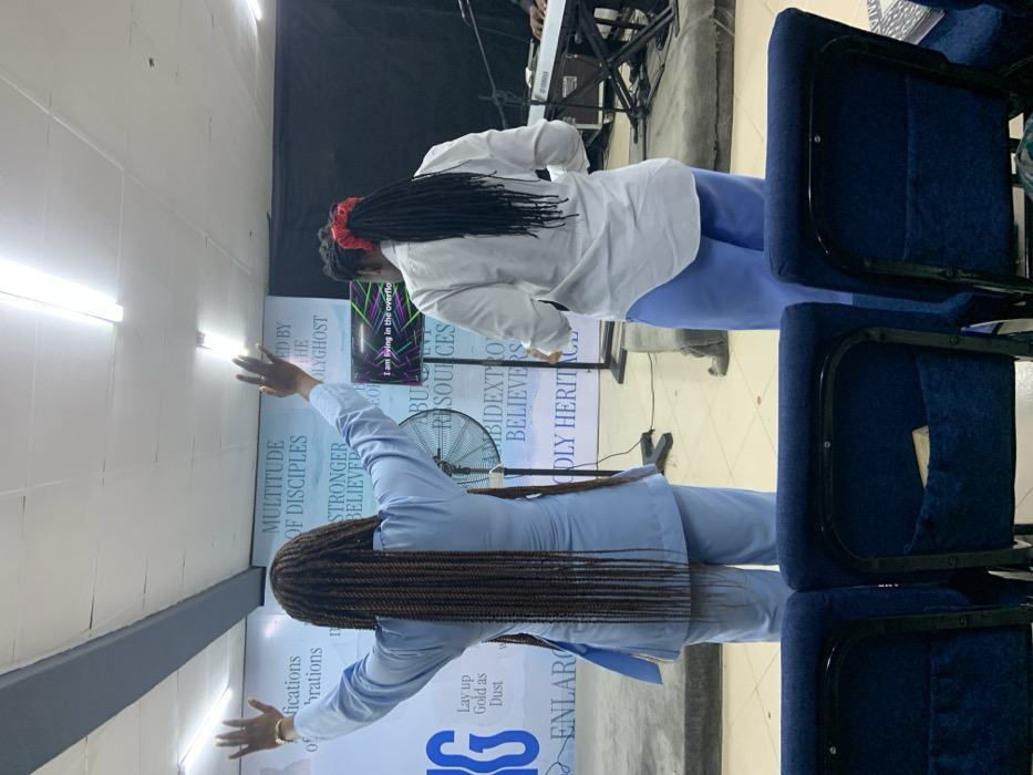 The image depicts an indoor gathering in Idimu, Nigeria, observed from behind two attendees