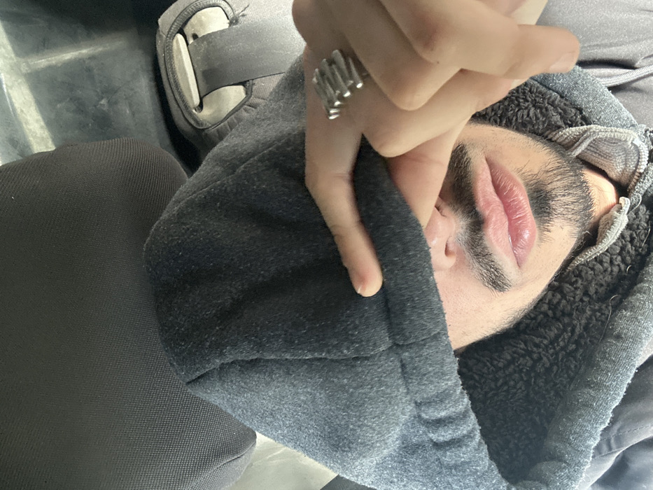 An individual is depicted seated within the interior of a vehicle, located in Chilly-Mazarin, France. The subject, identifiable by their lower face featuring a mustache and beard, is wearing a dark grey hooded sweatshirt with a textured, possibly sherpa-lined interior collar. Their right hand is raised, with the index finger positioned horizontally across the upper face, obscuring the eyes. A silver-colored, multi-bar design ring is present on the ring finger of the visible hand. Behind the individual, a dark fabric headrest is visible. To the right of the subject, a black seatbelt strap is engaged in a light-colored buckle receptacle, integrated into the vehicle's seat structure. The overall lighting suggests an indoor or vehicle interior environment.
