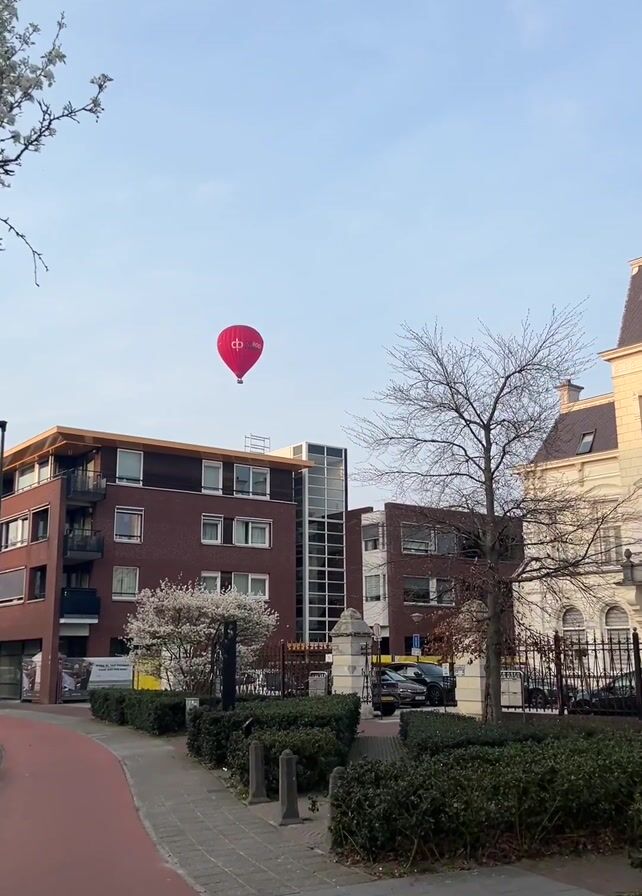 hot air balloon floating in the sky above a neighborhood street. The hot air balloon is red with a logo on it. The buildings in the neighborhood are brick with windows. There are trees and bushes on the side of the street. The sky is blue. The video appears to be shot from a low angle.