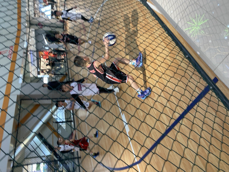 The image displays an indoor basketball court scene, located in Linghe, China, observed through a prominent green diamond-mesh safety fence