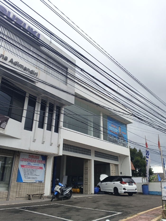 The image displays the exterior of a two-story white commercial building, identified by "SUZUKI Adimandiri" signage near the top left