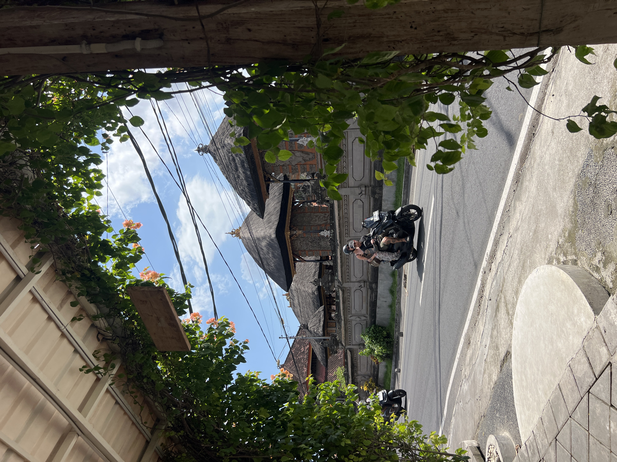 Location: Mengwi, Indonesia. A street view framed by foliage and a wooden structure at the top. The sky with scattered clouds is visible through the leaves. A traditional Balinese building with a thatched roof is on the left side. A motorcycle with two riders is on the road. A second motorcycle is parked on the side of the road. A fence is on the left side. A concrete path is on the right. Power lines are visible in the sky.
