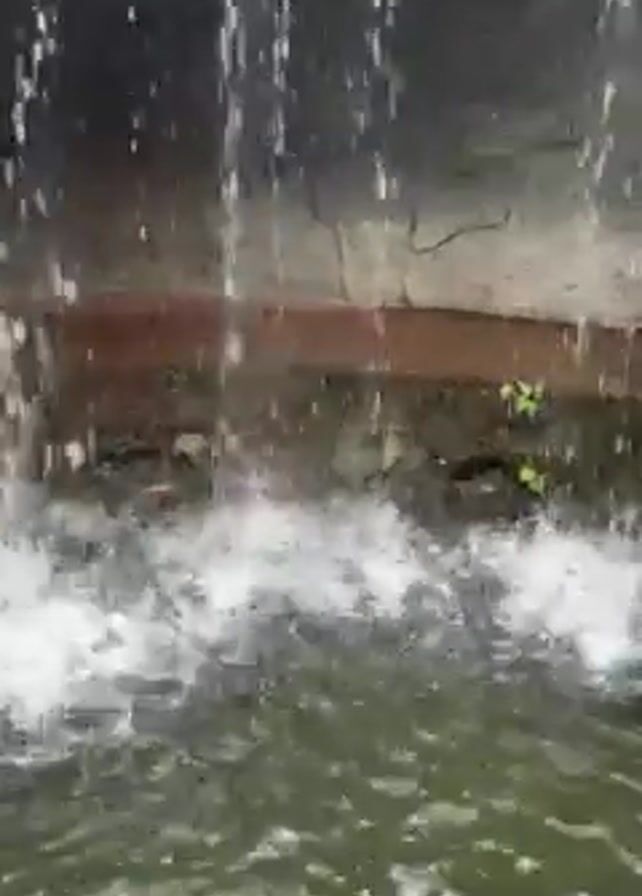 small waterfall cascading into a pool of water. The waterfall has a dark rocky backdrop with a brown ledge. Small plants can be seen growing near the base of the waterfall. The water in the pool is slightly green, with white foam from the falling water. The edge of the pool is bordered by wooden planks. The camera is stationary and focuses on the waterfall.