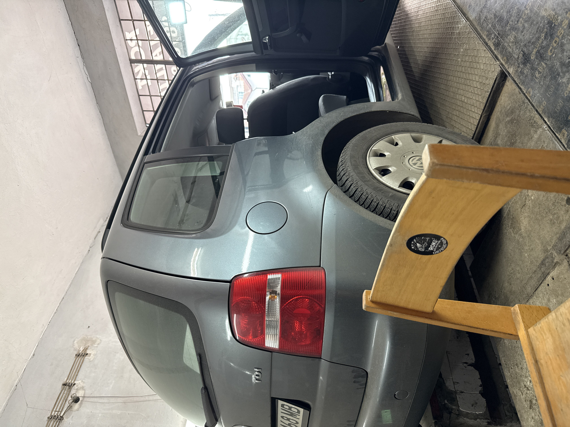 The image displays the interior of a garage or workshop located in Cherven Bryag, Bulgaria. A grey Volkswagen TDI minivan, bearing the partially visible Bulgarian license plate "P 468 MB", is the central subject. The vehicle's rear passenger side door is open, exposing a dark interior with gray seat upholstery. The car is elevated at the rear, resting on concrete blocks or ramps, with its front wheels positioned on metal diamond-plate flooring. The rear bumper is dusty, and visible parking sensors are integrated into it. In the immediate foreground, a light brown wooden chair is positioned with its backrest facing the viewer. A black circular sticker on the chair's backrest displays the text "ROKI", "AUTO DETAILING", and a phone number "0878587484". The environment consists of worn, light-colored concrete walls exhibiting cracks and areas of chipped paint. Exposed electrical conduits run along the upper portion of a wall. The concrete ceiling also shows cracking. A large window with a visible metal grid is situated in the upper right background, admitting ambient light and reflecting what appears to be external residential structures with red roofs. The floor is composed of stained concrete interspersed with metal grating and dark, possibly rubber, matting. No individuals are present in the scene.