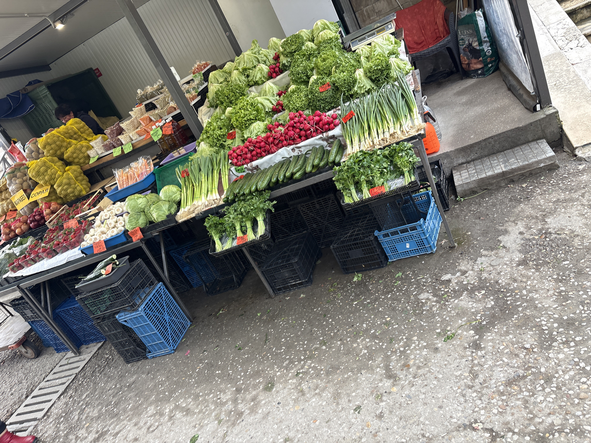 vegetable and fruit stand at a market. The location is Veliko Tarnovo, Bulgaria. The stand has an assortment of vegetables including lettuce, radishes, cucumbers, scallions, cabbage, parsley, potatoes, onions, beans, carrots, fruit, and mushrooms. The produce is arranged on tiered tables. Many black and blue plastic crates support the tables and store additional produce. A person is visible behind the produce. Stairs are visible to the right. A pet food bag is visible near the stairs. The ground is concrete and appears slightly dirty.