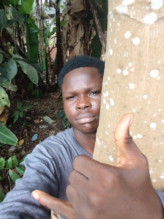 A young Black male subject is positioned outdoors in Eziudo, Nigeria, partially obscured by a large, light-brown tree trunk with irregular white spots dominating the right side of the frame. The subject wears a plain grey long-sleeved t-shirt and has short, dark, closely cropped hair. His face is directed towards the camera, exhibiting a neutral expression with a slight pout. His right arm is extended, and his hand displays a 'thumbs-up' gesture. The background consists of dense tropical foliage, including large green leaves (possibly banana plants) and dried brown leaves, indicating a natural, verdant environment. In the upper left background, a light-colored building with dark-framed windows is partially visible through the vegetation. The ground visible beneath the foliage is natural earth with scattered debris.
