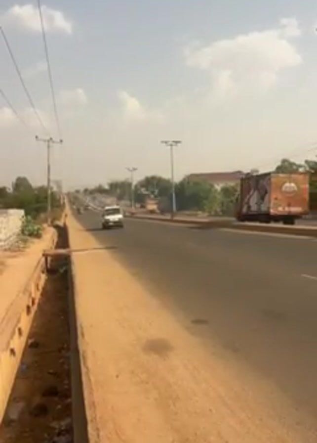 wide asphalt road on a bright, sunny day. The road is mostly empty, with only a few vehicles visible in the distance and one white pickup truck passing by in the foreground. The truck appears old and slightly worn. There are streetlights lining the road, some of which appear to be solar-powered. The road is flanked by a concrete barrier on one side and a green area with trees on the other. In the distance, there are buildings and more vegetation. The sky is pale blue with scattered white clouds.