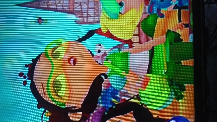 This image displays a stylized cartoon scene, captured as a photograph of a screen, evidenced by prominent vertical scan lines across the entire frame and a dark border at the bottom