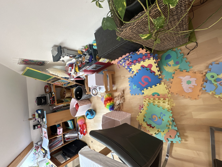 The image displays a cluttered indoor room, identified as being in Grünwald, Germany, characterized by a light wooden floor, white walls, and a sloped ceiling featuring an exposed wooden beam. Natural light enters from a window in the upper left. In the foreground, a dark-colored chair and a white-tablecloth-covered table are partially visible on the left. The floor space is largely covered with numerous interlocking foam play mats in various colors (blue, yellow, orange, green, pink) featuring cutout numbers (e.g., '5') and animal shapes (e.g., snail, dinosaur, butterfly), scattered or stacked in various configurations. To the left, a multi-tiered wooden bookshelf is packed with books, binders, and office supplies; a black soft-sided bag rests on the floor nearby. Adjacent objects include a pink fabric storage bin, a blue and white soccer ball, a multi-colored beach ball, and a pair of red clogs or sandals. Further right, a rainbow-colored feather boa and some brown fabric items are situated near a small wooden doll bed and a white toy appliance. Against the right wall, a red and black toy kitchen set with miniature pots and utensils, and a grey and black toy structure are present. A green chalkboard easel leans against the wall behind them. A large, dark brown woven basket containing a green leafy plant with variegated leaves stands in the far right foreground, positioned next to a black rectangular storage unit. Two framed or laminated pictures are mounted on the upper right wall. The room also contains various other storage containers, including a black bucket and a light pink fabric bin with red contents, alongside additional wooden shelving holding baskets of items. The scene suggests a recently occupied play area.