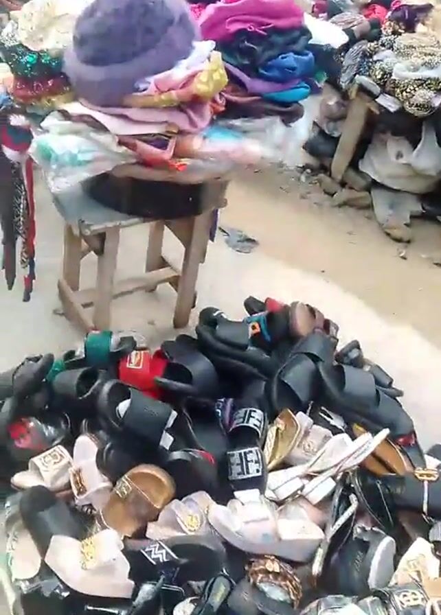 scenes from an outdoor market. In the first scene, there is a pile of sandals and shoes, and in the background, there are clothes for sale on a stool. The second scene shows a collection of hats, also displayed on a stool, along with a pile of sandals. The third scene shows an array of plates piled high with red tomatoes and red peppers, likely for sale. People are walking by the produce stand. The final scene features the tomato and pepper stand along with other items being sold, including brightly-colored, individually-wrapped plastic spoons and other small goods. There are several people in the background, some sitting and others browsing the market.