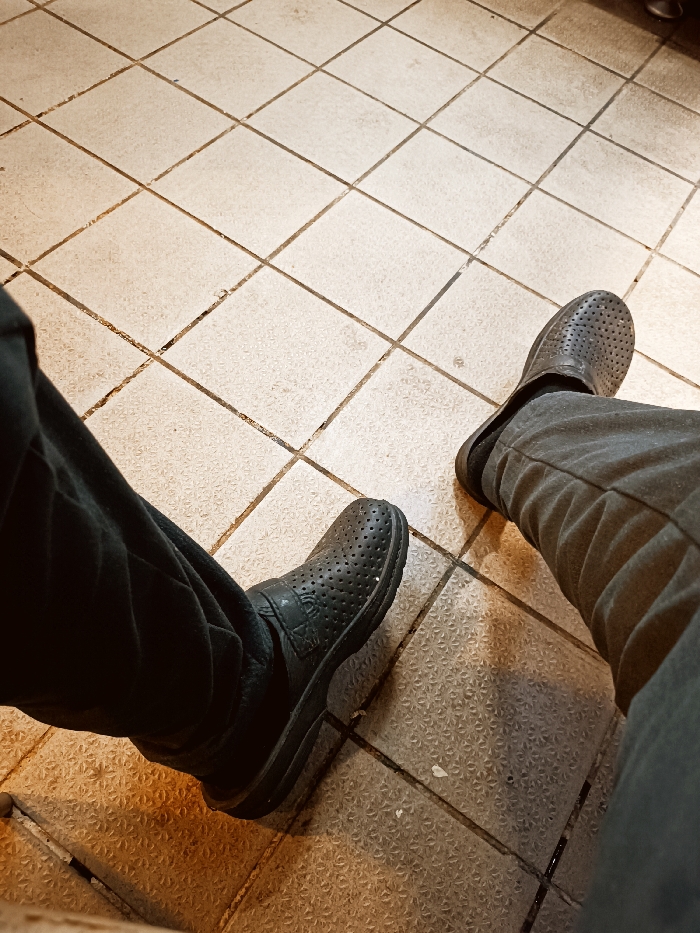 A first-person perspective shot shows a person seated with their legs extended onto a tiled floor. The tiles are light with dark grout lines. The person wears dark-colored slip-on shoes with small perforations and elastic side panels. The left leg is clad in dark, possibly black, pants, while the right leg is in gray trousers. The lighting is somewhat warm, with shadows visible.
