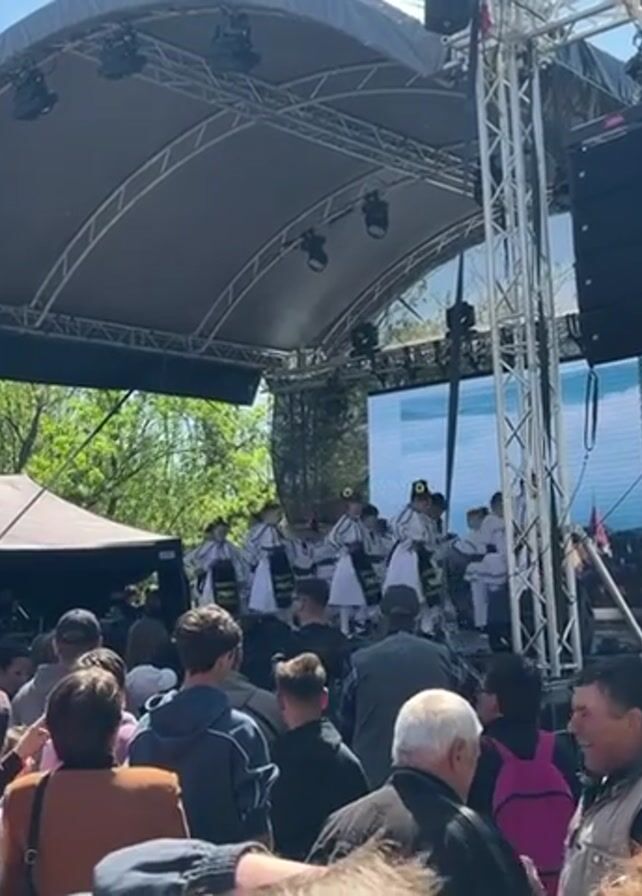 A stage has been set up in an outdoor area, with a crowd of people watching a performance. The stage has a curved roof structure supported by metal frames. Speakers and lights are mounted on these frames. Behind the performers, a large screen displays moving images. The crowd is a mix of ages and genders, many holding up phones to record the event. There is a tent visible to the left of the stage. The performance involves a group of people dressed in traditional white costumes with black embroidery, who are moving in unison. The background features trees and a clear blue sky. The ground appears to be paved. The overall impression is of a community gathering to watch a cultural performance.