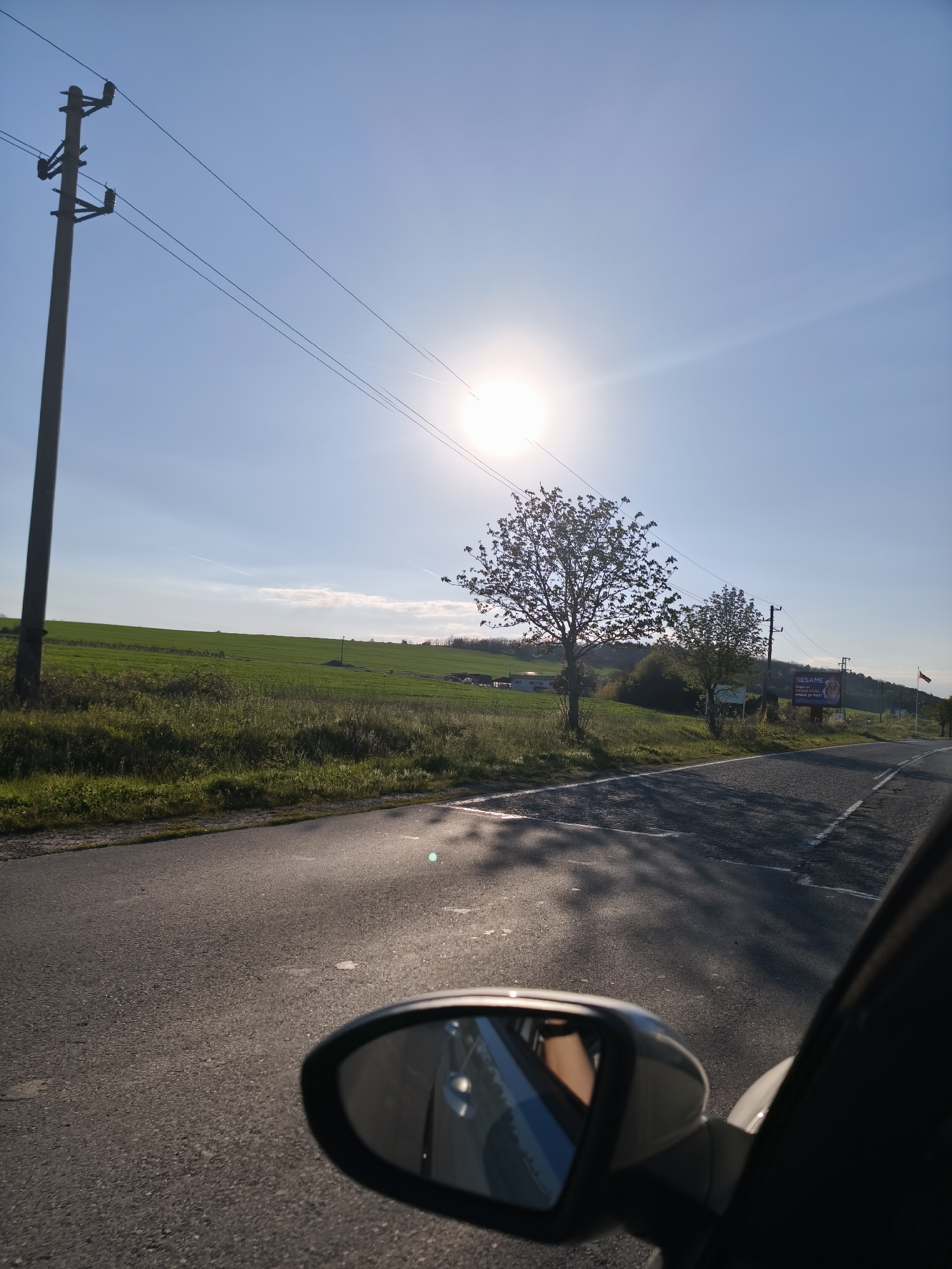A view from inside a moving vehicle shows an asphalt road with tree shadows cast across it. The car's side mirror is visible in the lower portion of the frame. The background features a green field with a power line and pole on the left side. A tree stands near the road, with more vegetation and a billboard further to the right. The sun shines brightly in the sky. The location is in Byala, Bulgaria, as the billboard advertises "SESAME" with a phone number including "+359 52," the country code for Bulgaria.