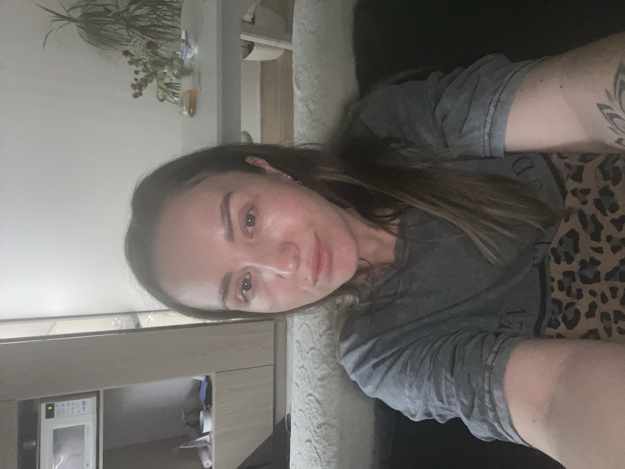 A selfie of a woman with brown hair and fair skin. She is wearing a gray t-shirt. A tattoo is visible on her left arm. She is lying on a patterned surface (likely a couch or bed with a leopard print cover). Behind her, a cabinet is visible with a microwave. In the background to the upper left is a shelf with a plant and flowers in vases. The location is not identifiable as Chemoshur, Russia from this image alone.