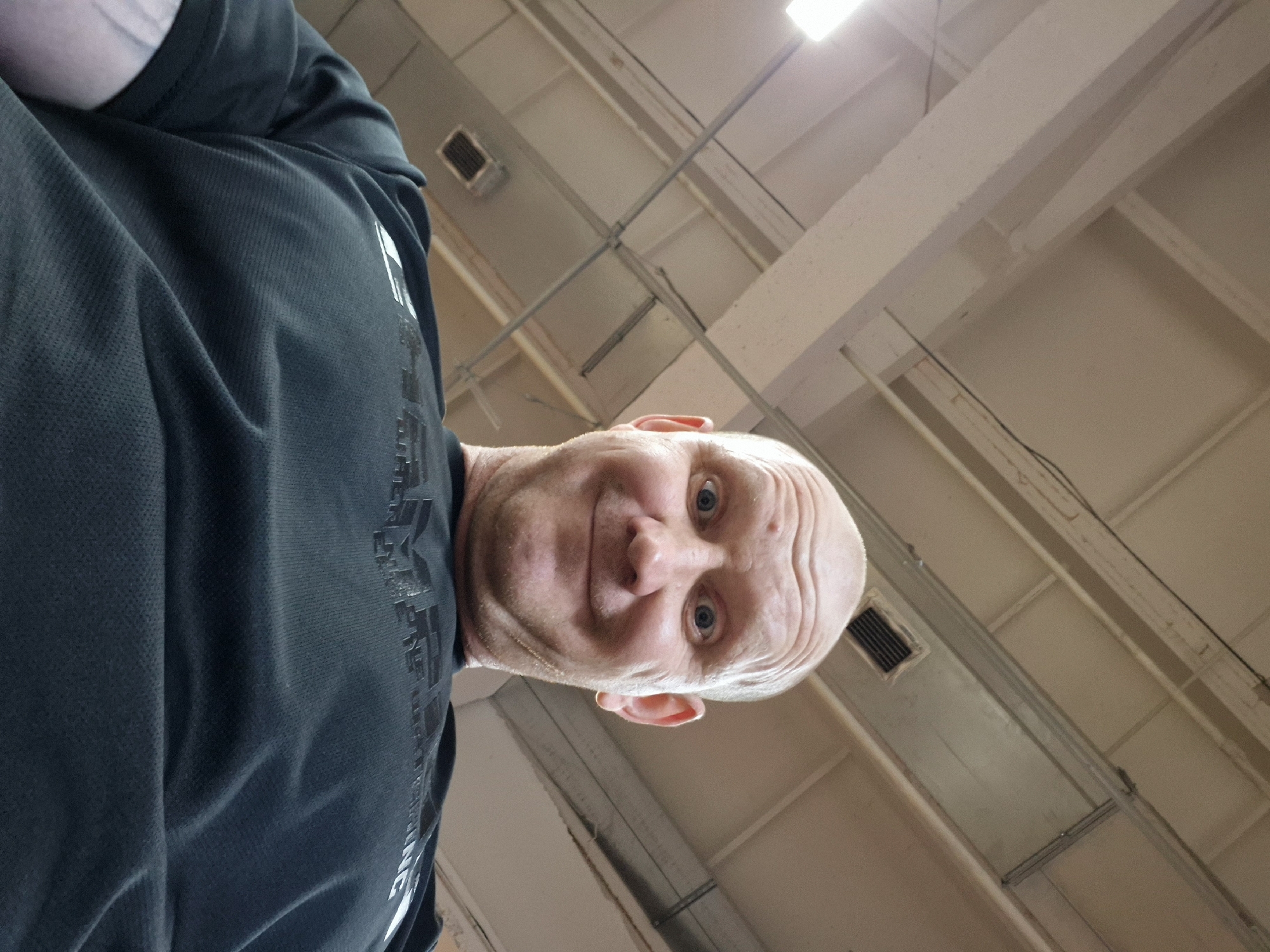 A man is looking down at the camera. He is bald and is wearing a black shirt. The background is a ceiling with pipes and beams. The location is difficult to determine.