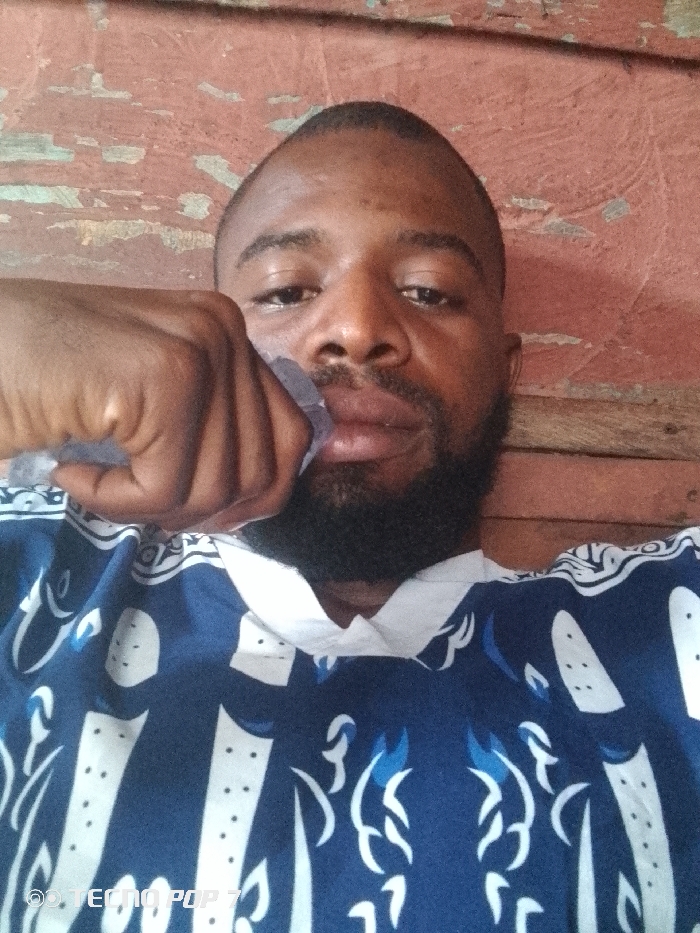 The image depicts an adult male, of apparent African descent, with dark skin and a short beard, captured in a frontal portrait