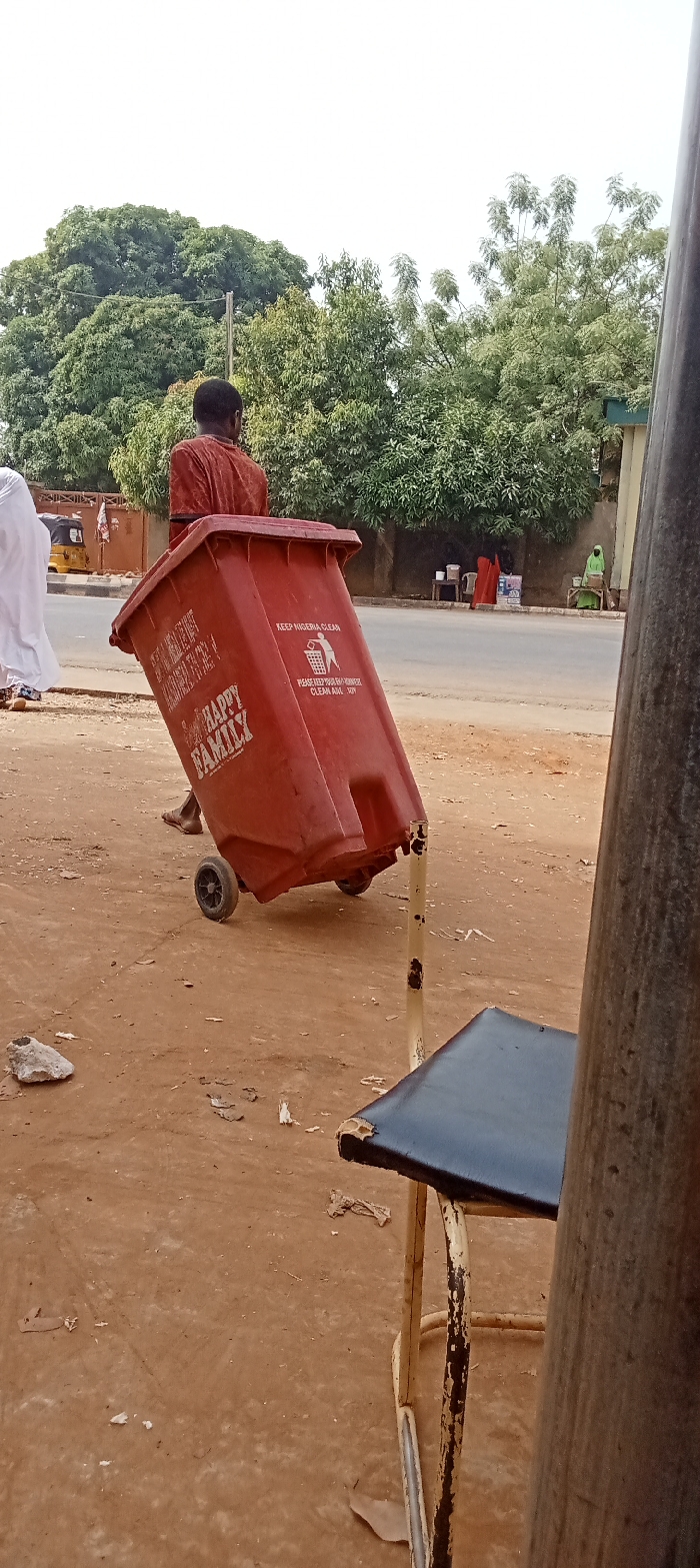 - "A male individual, barefoot and dressed in a rust-colored short-sleeved shirt, is observed from behind, pushing a large, red, wheeled refuse bin across a reddish-brown dirt path in Kabala, Nigeria" by FM-gYzzh1, licensed under CC BY 4.0