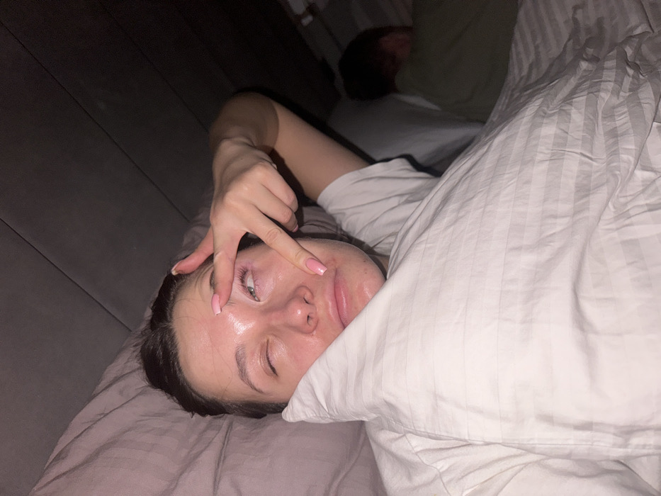 A young woman lies in bed, partially covered by a white striped duvet. She makes a peace sign near her eye, with a shiny face and pink manicured nails. The room is dimly lit, with a dark wooden wall on the left. Another person is visible in the background, also in bed. The sheets and pillow appear to be light gray.