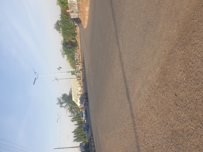 This image captures a wide-angle daytime view of a paved asphalt road, likely part of an intersection or roundabout, in Jos, Nigeria