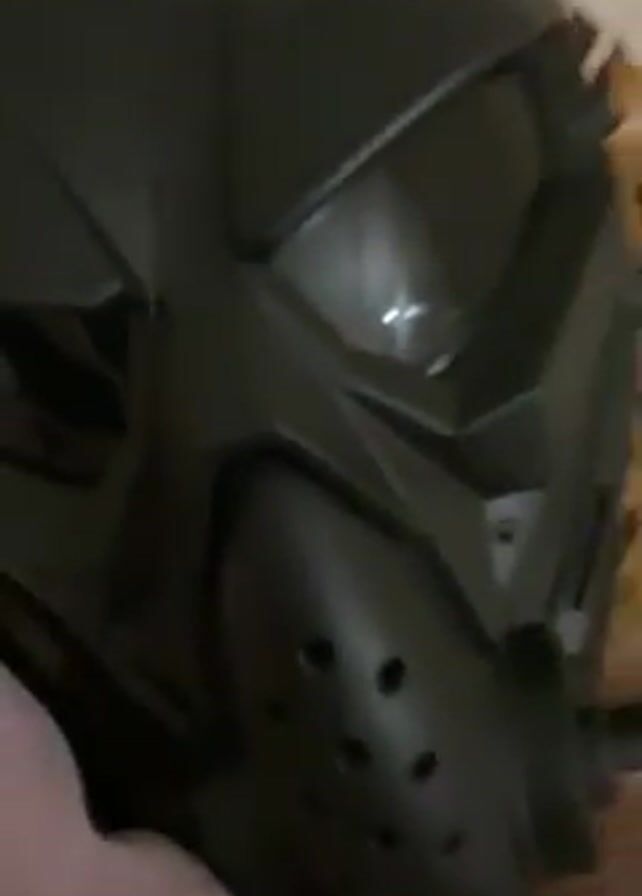 A dark, angular mask sits atop a tan animal print blanket and soft pink fabric. A hand makes a peace sign beside the mask. The room is lit by natural light coming in from a window. The mask appears to be made of dark plastic and has a visor and a perforated section covering the mouth area.