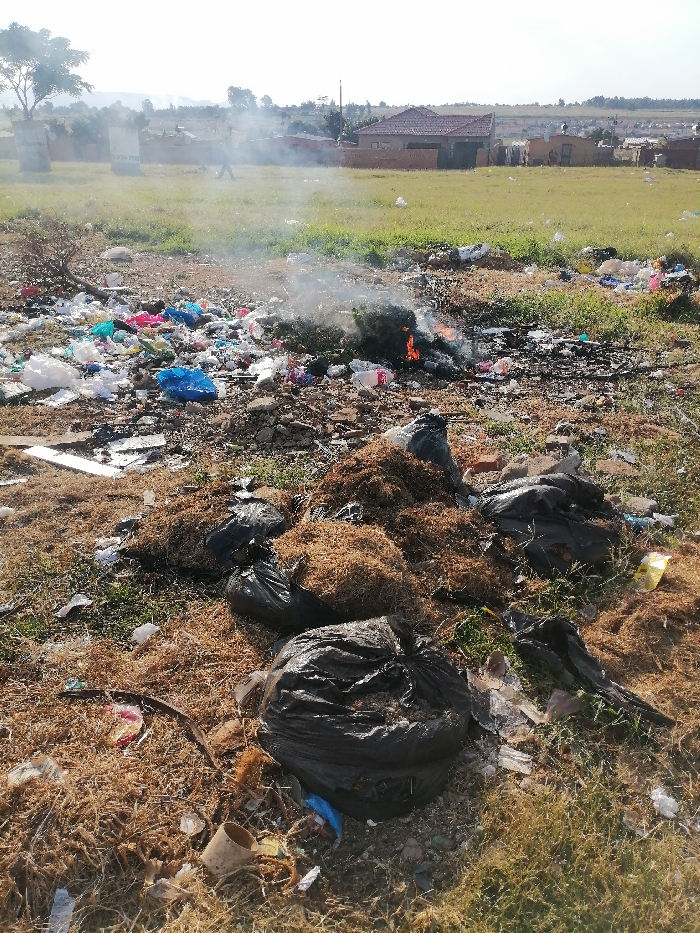 A field is littered with trash, including plastic bags, containers, and other debris