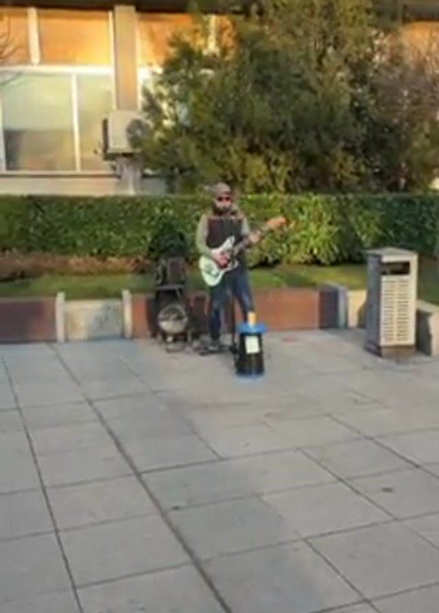A street musician plays guitar and sings on a sidewalk