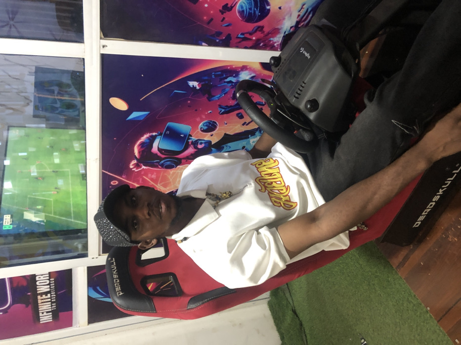An interior view depicts a young adult male seated in a red and black "DERSKULL" gaming chair within a gaming establishment in Adankolo, Nigeria. The male, wearing a studded black baseball cap, a white polo shirt with "Freetown" in yellow script, and dark trousers, is looking directly forward. A black "Logitech" racing wheel peripheral is mounted in front of him. The background features colorful wall art, including a poster reading "INFINITE WORLD the experience" and a mural depicting a man in a VR headset. Above, through a partition, a television screen displays a soccer video game. The floor consists of green artificial turf on the left and brown wood on the right.