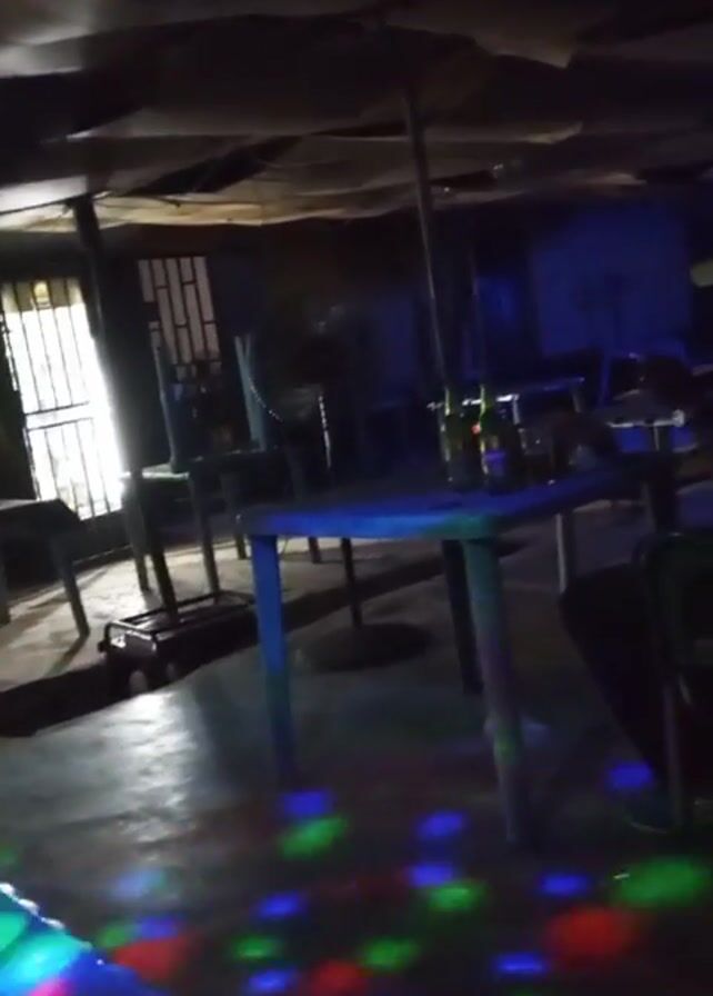 interior of what appears to be a dimly lit bar or club, with colorful lights projecting patterns on the floor and tables. The space is furnished with simple plastic tables and chairs. A fan is visible in the background, along with a television mounted on the wall. There are bottles on some of the tables. One entrance has an iron gate. A water bottle sits on the table closest to the camera. Music is playing.