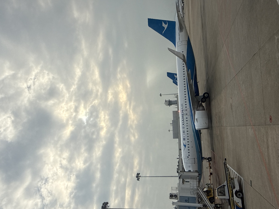 A XiamenAir airplane, with its blue and white livery, is parked on a concrete tarmac at an airport. A jet bridge is connected to the aircraft. The sky is overcast with varying cloud formations. Support vehicles are positioned near the plane. Another XiamenAir plane is visible in the distance. The view is from an elevated position, possibly inside a terminal.