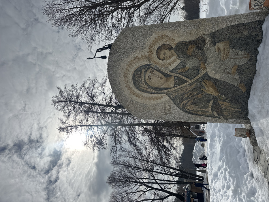 The image depicts a winter outdoor scene in Местечко Раифа, Russia. A large, rounded monument, approximately 2.5-3 meters tall, stands prominently in the foreground, constructed from numerous small, light-colored pebbles. Embedded within this monument is a mosaic depicting the Georgian Mother of God: the Virgin Mary, dressed in dark robes, holds the infant Jesus, who wears lighter attire and grips a small, dark object. Both figures are rendered with halos, and Cyrillic text, including "Грузинская" (Georgian), is visible within the mosaic. A dark, wrought-iron ornament featuring a suspended bell-like element is affixed to the top of the monument. At the monument's base, two smaller, pebble-covered cylindrical objects are partially obscured by snow. The ground is extensively covered with uneven snow, through which a paved pathway is partially visible at the base of the monument. Numerous bare deciduous trees are scattered throughout the midground and background, their dark branches silhouetted against the sky. In the midground, several individuals are present: one person in dark clothing walks left near a small, red-roofed kiosk; a group, including an individual pushing a stroller, moves further back; and another person stands near a small building. The background reveals a wide, flat expanse of snow, indicative of a frozen body of water, bordered by distant trees. The sky is mostly cloudy, with the sun partially visible through a break, creating a bright glare and lens flare in the upper left quadrant.