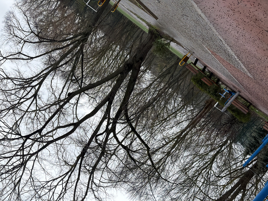 The image presents a tilted, forensic view of a public park or recreational area in Dobrich, Bulgaria, under an overcast sky. The foreground features a wet, reddish-brown, textured paved surface, likely rubberized, diagonally traversed by a light-colored paved path. Several bare, deciduous trees with intricate branch patterns dominate the background, forming a dense treeline that extends from the lower-left to the upper-right. These trees are silhouetted against the grey sky, indicating a dormant season. Park amenities include multiple wooden benches with metal frames; one bench displays a yellow frame, another has a brown frame, and parts of a blue-framed outdoor fitness or playground structure are visible in the lower-left. A strip of damp green grass lies between the paved areas and the treeline. A green mesh fence is partially discernible behind the benches and equipment. No individuals are present in the scene, and no actions or interactions are occurring.