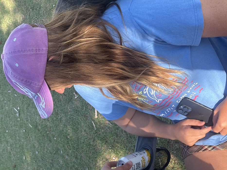An overhead shot shows a person wearing a light blue T-shirt with a colorful dolphin design and the words "ME/FIT CLEAN LIVING 2022." They are holding a black phone. A purple baseball cap sits on their head. Their brown hair cascades down their back. A hand extends a can toward them. They are wearing brown plaid shorts and sitting in a black folding chair on a grassy lawn.
