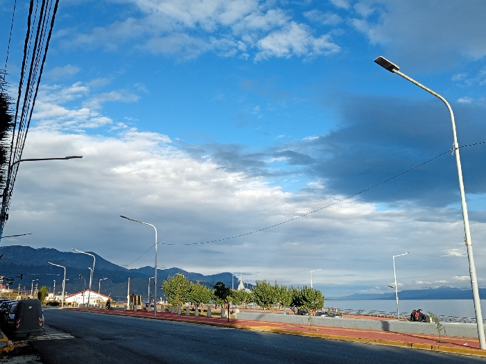 A waterfront street scene under a sky filled with blue and white clouds, along with darker gray clouds. A row of street lights line the road, which includes a red-paved lane beside it. The road is flanked by parked cars and trees. Mountains are visible in the background across the water. Two people are sitting on the wall, enjoying the scenery. Power lines are visible at the top left of the image.