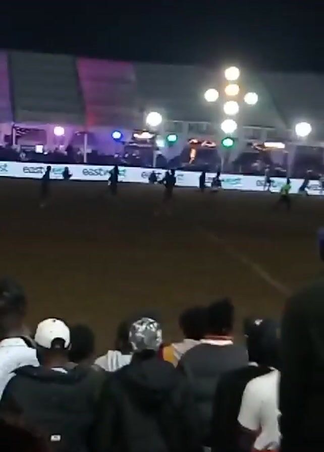 night-time scene of a soccer game being played on a grassy field, observed by a crowd of spectators. The field is illuminated by bright overhead lights, and a large tent-like structure, illuminated with white, green, and purple lights, stands behind the field. Banners with text are visible above the structure. The players, dressed in dark uniforms, are actively playing the game. The spectators in the foreground are facing the field and are wearing various casual clothing, including jackets and hats.