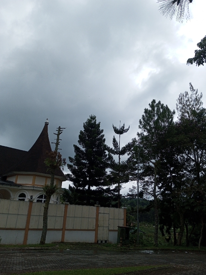 This image depicts an outdoor scene in Orehat, India, under a heavily overcast, dark grey sky, indicating diffused light conditions. On the left, a portion of a building with light-colored walls and several arched windows is visible, featuring a prominent dark brown, conical roof topped with a small finial. A slender, light-colored tree trunk or utility pole stands directly next to the conical roof. A low, light-colored wall with vertical orange-brown sections extends across the mid-ground, separating the building area from an open space. Behind and to the right of this wall, multiple tall, dark green coniferous trees with varied branch patterns are present; one distinct tree exhibits a trident-like formation at its upper section. Further beyond the trees, a hazy, lighter green hillside is visible. The foreground consists of a paved surface, resembling interlocking pavers, with several dark, wet patches, suggesting moisture. A strip of green grass runs along the edge of the paved area, and a small, dark green utility box or shelter is positioned near the wall on the right. No individuals, explicit actions, or interactions are visible in the scene.