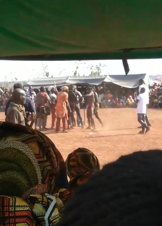 The video captures a gathering of people on a dusty, red-dirt field. The scene is partially viewed from under a green canopy. In the center of the field, a group of men, some wearing traditional attire, are interacting, possibly in a ceremonial or competitive manner. Two men wearing dark blue shirts with the abbreviation "KADVS" on the back stand guard or are observing the event. There is a large crowd of spectators in the background, observing the central activity. A woman in an orange dress stands among the group of men in the center. The foreground is partially obscured by colorful patterned fabrics and the back of someone's head. The overall atmosphere suggests a cultural event or festival.