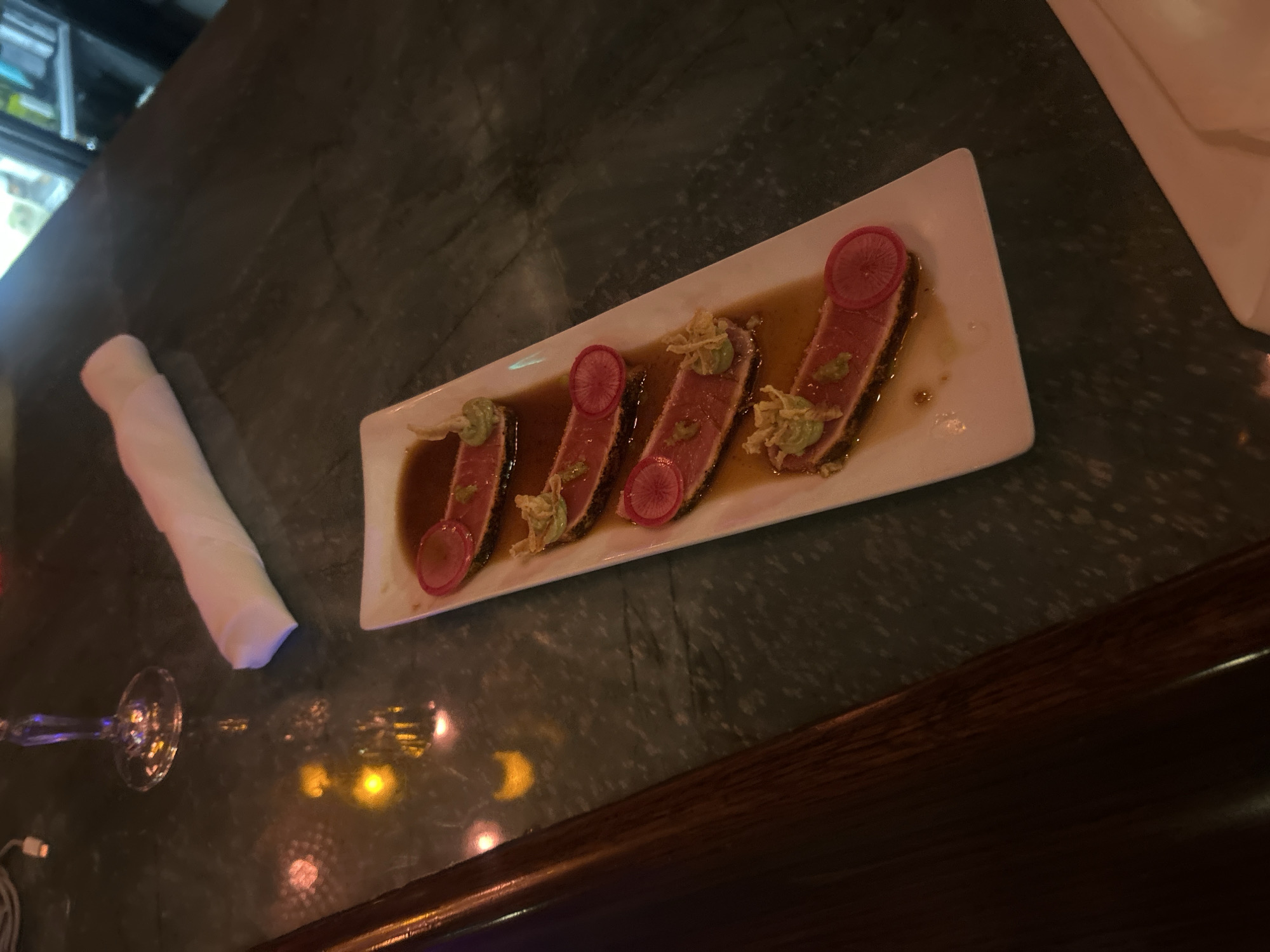 - "A high-angle shot shows a rectangular white plate with four pieces of seared tuna topped with pink radish slices and what appear to be fried leeks or similar garnish, drizzled with a dark sauce" by FM-JqEJc2, licensed under CC BY 4.0