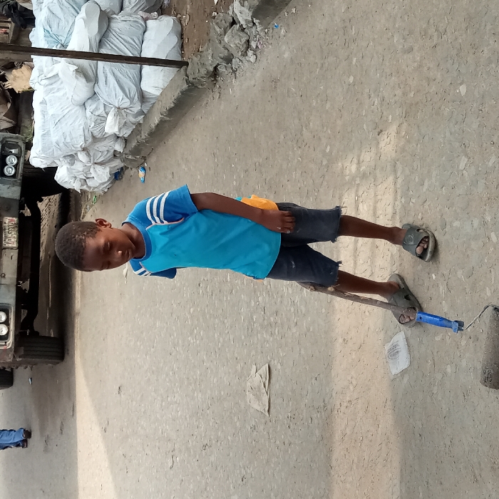 A young boy stands on a dusty street, holding a paint roller and wearing sandals. He is dressed in a blue t-shirt with white stripes on the sleeves and dark shorts. To his left, a truck is parked with large sacks piled on its bed. The background includes a street surface with some litter and debris scattered around. The scene suggests an urban or possibly a developing country environment.