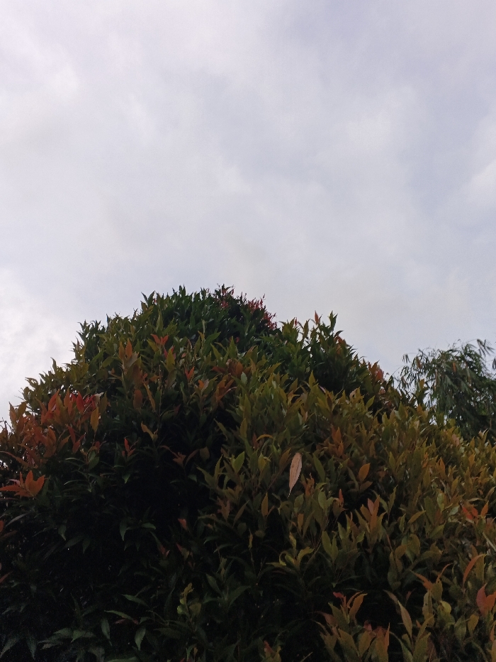 An outdoor scene in the city of Kyauk Hsoke, Myanmar, displays a dense canopy of trees against an overcast sky. The lower two-thirds of the image are filled with foliage, primarily from a large tree or bush characterized by a mix of dark green, lighter green, and numerous reddish-orange leaves. A separate, lighter green plant with slender leaves is partially visible on the far right. The upper one-third of the frame reveals a sky entirely covered by uniform light grey and white clouds. No individuals, structures, or artificial objects are present. The lighting is diffused, consistent with an overcast environment.