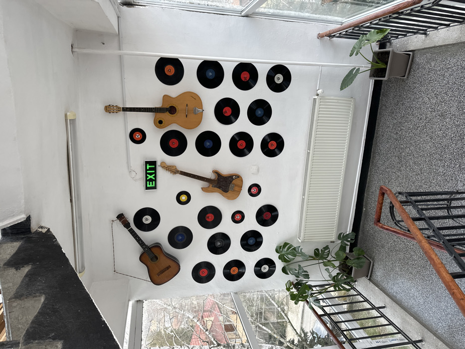 The image displays an interior stairwell landing within a building in Razgrad, Bulgaria. A white wall dominates the central portion, functioning as a decorative display surface. Three guitars are mounted on this wall: a natural wood acoustic guitar hangs from a string on the upper left, a natural wood electric guitar with a distressed finish is centrally positioned, and a second natural wood acoustic guitar with a cutaway body is on the upper right. Approximately 25 to 30 vinyl records, including both 12-inch and 7-inch formats with varied colorful labels, are affixed to the wall, arranged around the guitars. A green illuminated "EXIT" sign is mounted above the central electric guitar. Horizontally below this display, a white panel radiator is installed. The floor is composed of speckled gray terrazzo. Two potted plants are situated on the floor: a large *Monstera deliciosa* on the left, and a smaller plant with broad green leaves to the right of the radiator. Black metal railings with reddish-brown wooden handrails delineate the stairwell, which descends towards the foreground. A section of a dark, concrete staircase is visible in the upper left. Large windows on both the left and right sides of the landing provide natural illumination and offer a view of an exterior winter scene, characterized by bare trees, snow-covered ground, and distant residential buildings with red roofs. Ceiling-mounted fluorescent light fixtures are also present. No individuals are depicted in the scene.