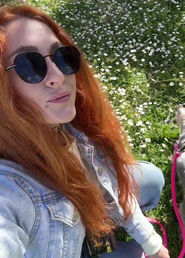 A woman with long red hair, wearing sunglasses and a denim jacket, sits on a grassy field dotted with small white flowers, holding a pink leash attached to a small, grey dog. The dog walks around a black, vertical object. The background includes a wire fence and a sunny sky.