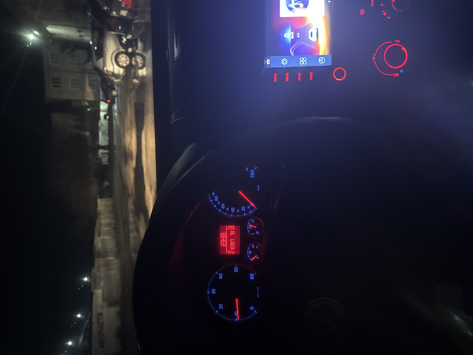 The image depicts a nighttime scene viewed from the driver's perspective inside a vehicle in Kaspichan, Bulgaria. The illuminated instrument cluster on the dashboard shows a time of 23:38, an odometer reading of 210,397 kilometers, and a trip meter reading of 78.0 kilometers. Both the tachometer and speedometer needles rest at zero, indicating the vehicle is stationary. The infotainment system on the right displays a graphical interface featuring a car on a road, alongside menu options like "RADIO" and "MEDIA." Outside the vehicle, the ground is wet with visible puddles and reflections of artificial lights. A low barrier or wall on the left side bears the Cyrillic inscription "АВТОЧАСТИ" (Auto Parts). In the background, multiple parked cars are visible, including a silver station wagon, and a multi-story building is faintly illuminated by a streetlight. No individuals are visible in the scene.