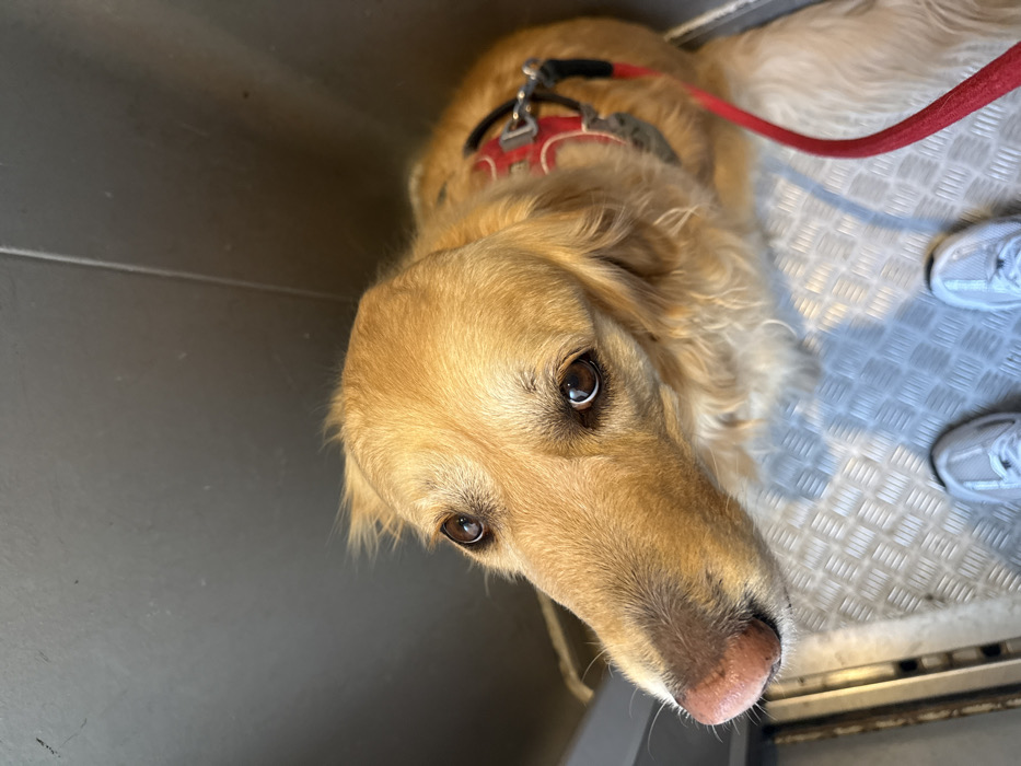 - "A light golden-furred Golden Retriever dog, wearing a red harness with a red leash attached, is situated on a silver-colored metal diamond plate floor within an enclosed space, likely an elevator, in Neuilly-sur-Seine, France" by FM-HFmI52, licensed under CC BY 4.0