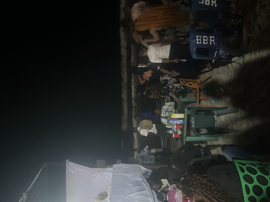 A group of people are gathered at night, possibly at a beachside event. Some sit at tables laden with drinks and snacks. Others relax on chairs. A white canopy tent is visible on the left. The scene is dimly lit. The chairs are blue and green, and some have the word "BBR" on them.