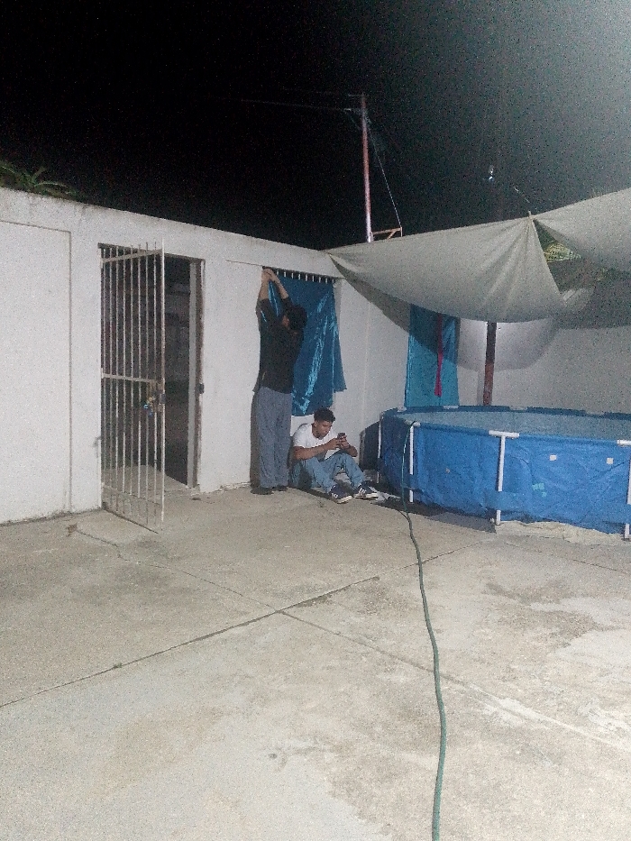 Two men are outside at night near a building. One man stands, adjusting something near the roofline. The other man sits on the ground, looking at his phone. A blue above-ground pool is positioned nearby, with a white canopy stretched above it. A green garden hose runs across the concrete patio towards the pool. A gate is open to a doorway on the left. An antenna stands on a pole in the background.