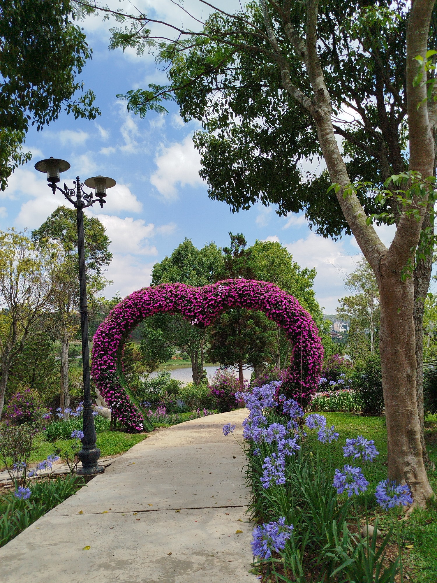 The image depicts a scenic view in Lâm Viên - Đà Lạt, Vietnam. A concrete pathway leads through a garden, framed by vibrant purple agapanthus flowers in the foreground. An archway shaped like a heart, adorned with densely packed magenta flowers, spans the path. Behind the arch, a serene lake is visible, with greenery and distant buildings completing the backdrop. A vintage-style lamppost stands to the left of the path, and the scene is partially shaded by trees with lush green foliage. The sky above is a mix of blue and fluffy white clouds.